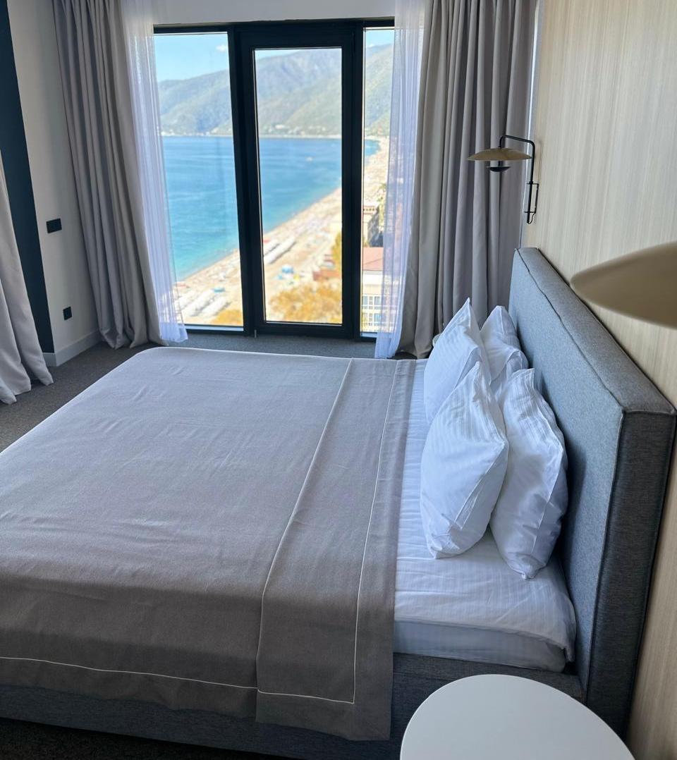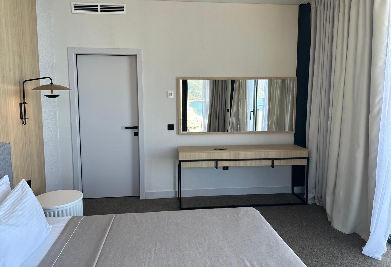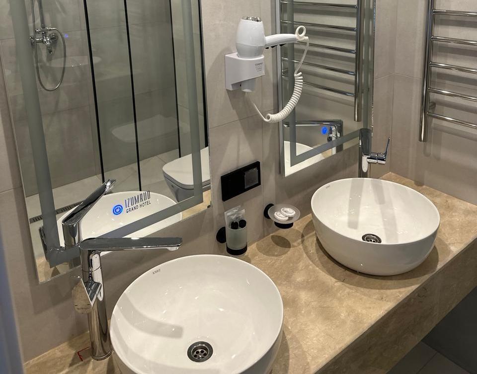 Площадь номера - 56 кв.м. 2 осн. места. 2 доп. места. Балкон. Мебель: вешалка, диван раскладной, зеркало, кровать двуспальная, прикроватные тумбочки, стол, стул, шкаф. Оборудование: кондиционер, телевизор, холодильник, чайная станция. Санузел: с душем, тапочки, туалетные принадлежности, фен, халат. Сервис: Wi-Fi бесплатно, смена полотенец, смена постельного белья, уборка номера.