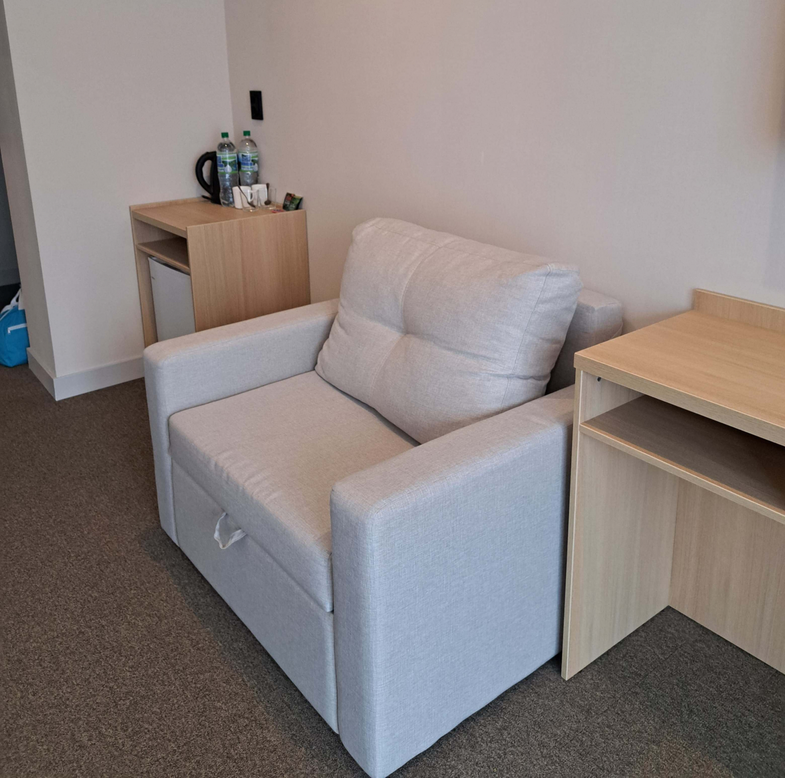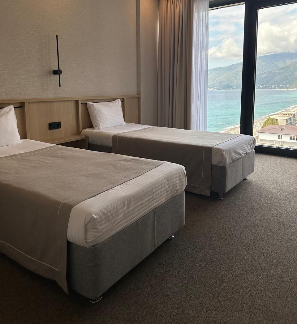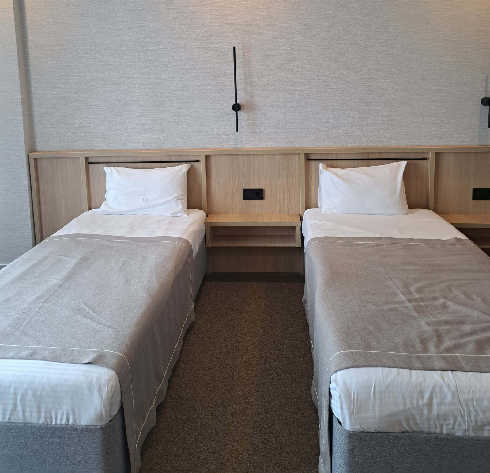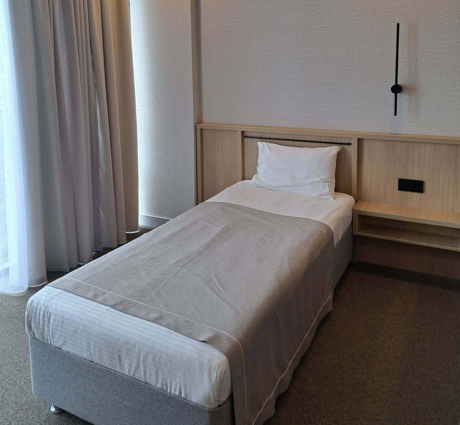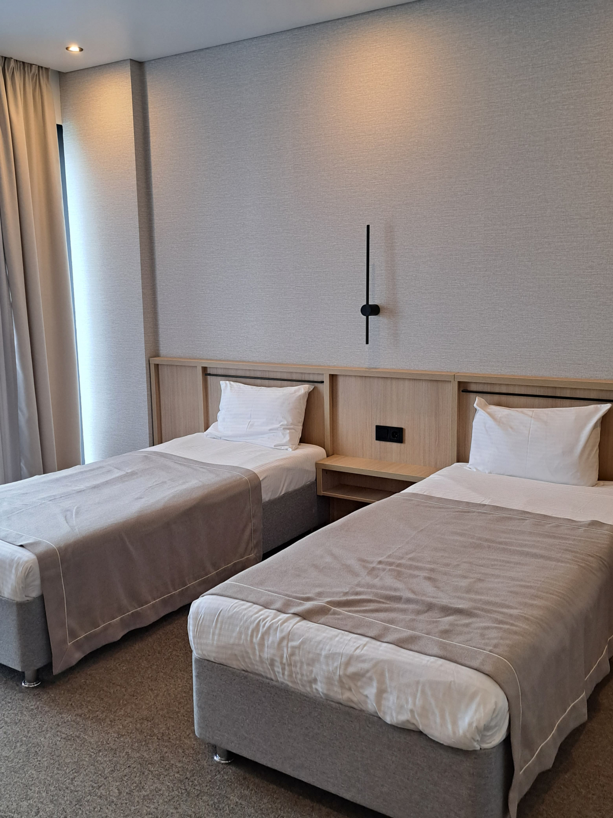 Площадь номера - 30 кв.м. 2 осн. места. 1 доп. место. Мебель: вешалка, зеркало, кровати односпальные (2), прикроватные тумбочки, стол, стул, шкаф. Оборудование: кондиционер, телевизор, холодильник, чайная станция. Санузел: с душем, тапочки, туалетные принадлежности, фен, халат. Сервис: Wi-Fi бесплатно, смена полотенец, смена постельного белья, уборка номера.