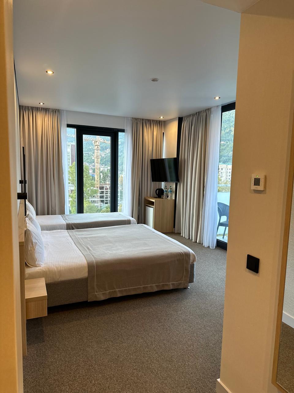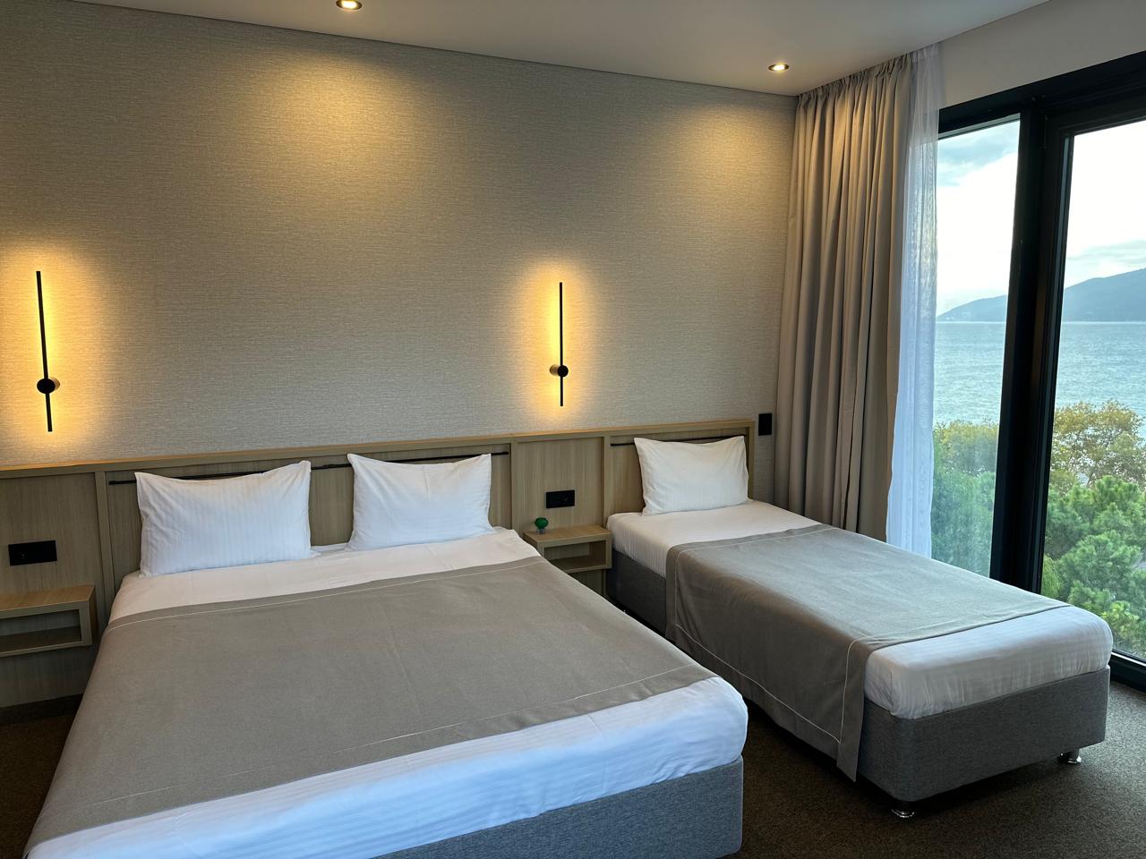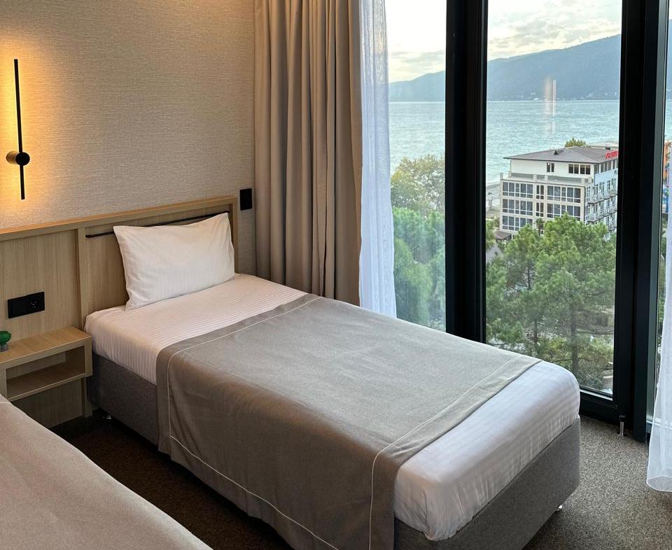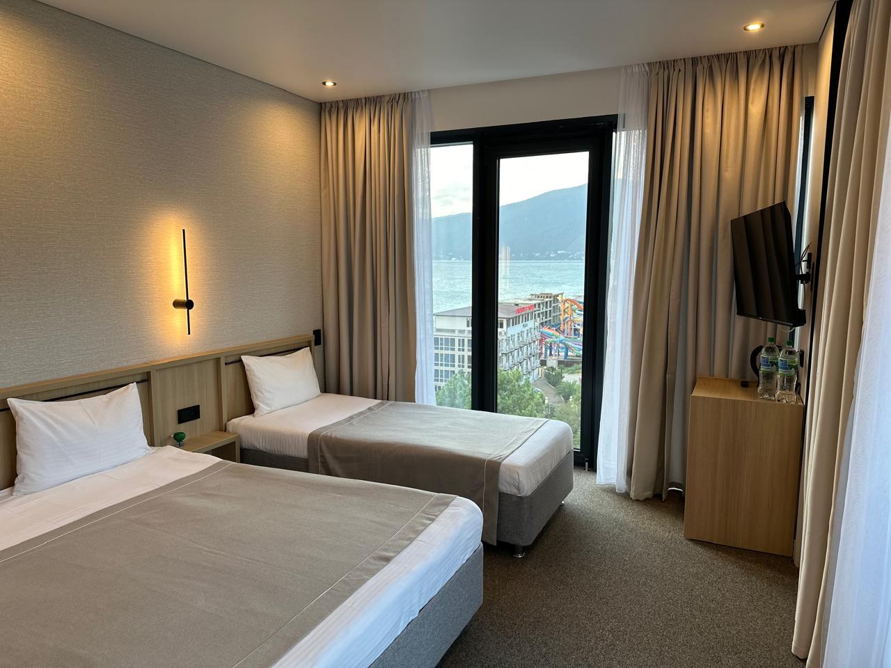 Площадь номера - 27 кв.м. 3 осн. места. Балкон. Мебель: вешалка, зеркало, кровать двуспальная, кровать односпальная, прикроватные тумбочки, пуфик, стол, шкаф. Оборудование: кондиционер, телевизор, холодильник, чайная станция. Санузел: с душем, тапочки, туалетные принадлежности, фен, халат. Сервис: Wi-Fi бесплатно, смена полотенец, смена постельного белья, уборка номера.